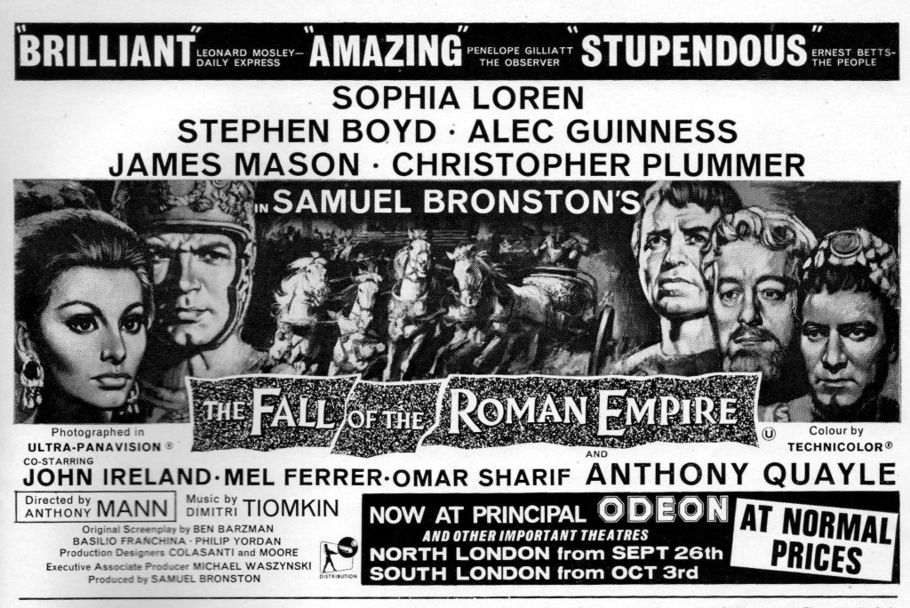 The title does not refer to an invasion of Rome by vast armies of barbarians but the internal corruption which signals the end of the empire. Audiences, taught Latin and Roman history as a matter of course at school around the time the film was released, would be more familiar with the subject matter, but hardly prepared for the spectacle.