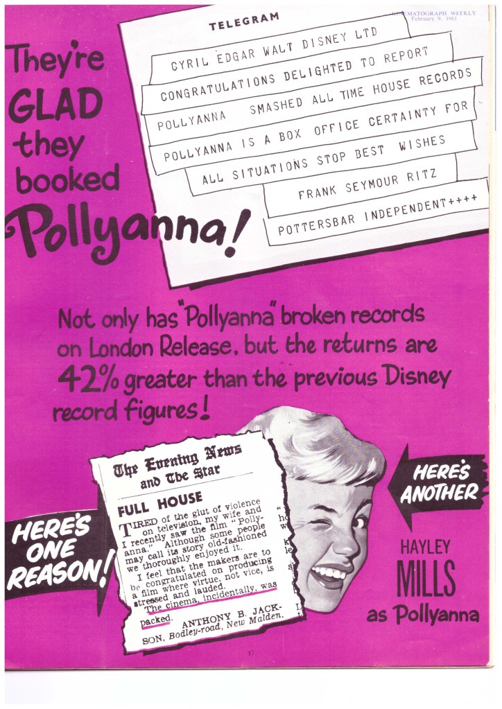 This Walt Disney version discarded much of Eleanor H. Porter’s original best seller not to mention a great deal of the tear-jerking section that played to superstar Mary Pickford’s strengths in the silent 1920 adaptation. Pickford was in her late 20s at the time and a movie mogul to boot (having launched United Artists) so had a depth of emotion Hayley Mills (aged 13 during filming) could not hope to match.