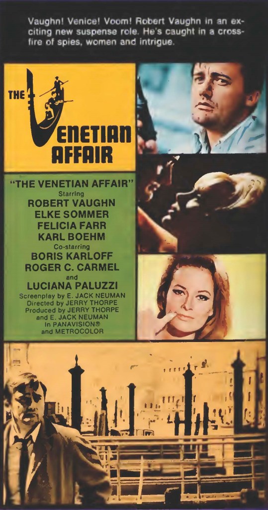 In fact, the plot for The Venetian Affair is so obtuse – although strangely enough, quite contemporary – that it would never have worked on film. The C.I.A. are trying to get hold of a fake letter that will implicate the U.S. and Britain in a plot to assassinate French President Charles de Gaulle (fake news in today’s parlance). So that was never going to work in a movie. Preventing an assassination, yes, but, of course, what a preposterous idea to think anyone could kill de Gaulle without having a time machine that could flash forward to Day of the Jackal. In any case, the C.I.A. only find out about the letter’s existence because someone picks up the wrong overcoat – so that’s not going to play either.