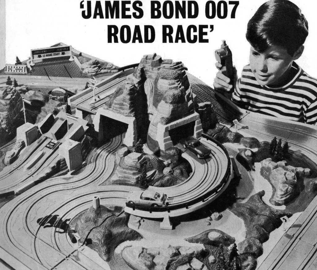 Toy manufactuer A.C. Gilbert had devised a James Bond 007 Road Race which would be promoted in the biggest marketing campaign in Sears Roebuck history to 60 million homes. The catalog would feature a five-page spread. “Beatles fans will be reached through a TV buy that Sears has made advertising the Road Race on ABC-TV’s Beatles Cartoon Show.” Adlers Slacks was the exclusive licensee for James Bond 007 Boys Slacks – with two hidden pockets. Revere Knitting Mills was promoting four sweaters “as worn by James Bond.”
