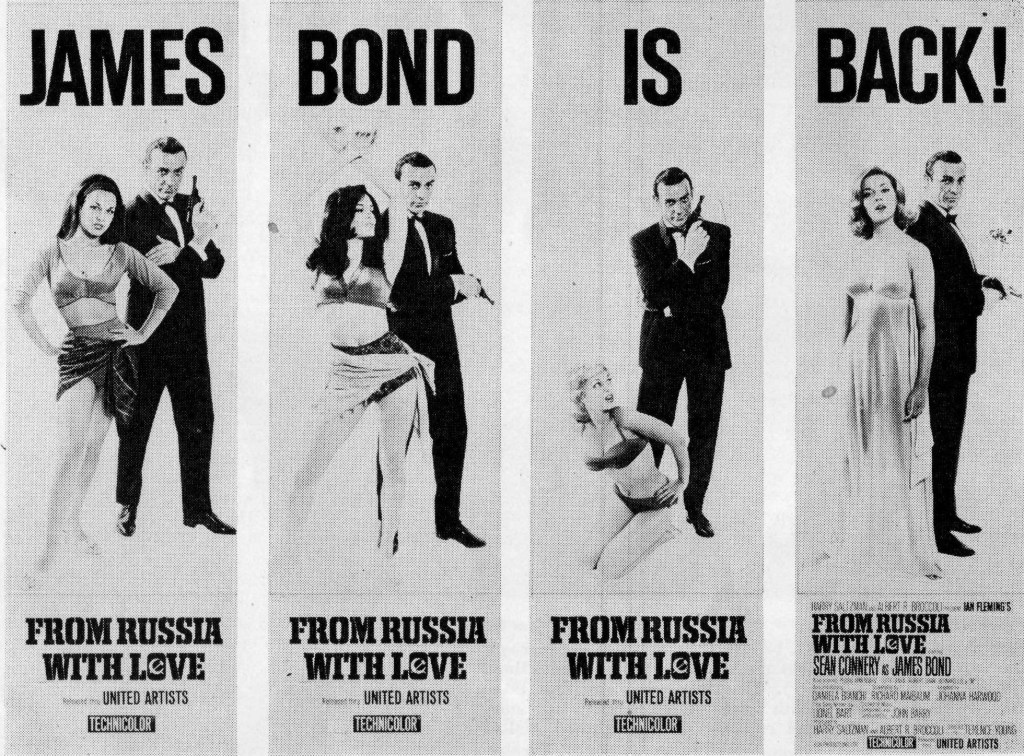 To target that marketplace, the adverts were more like a relaunch, not a sequel, and the taglines began with “Meet James Bond, Secret Agent 007.” And then, “For those unlucky few who missed Dr No…You are unprepared for the sophisticated mayhem and polished lovemaking. The James Bond bug has not bitten you. But take heart! There is still time to jump on the Bond bandwagon with the second James Bond adventure From Russia with Love. See it and we guarantee – you will be hooked for good.” The final exhortation: “Don’t you think it’s time you met secret agent 007?”