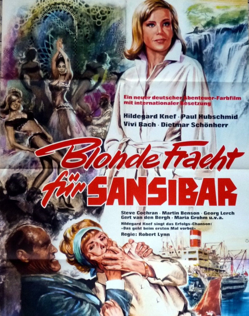 But Towers always got his money’s worth. Although making a (plot) point, there was another reason for Ilona singing. Knef had relaunched her career in the early 1960s as a singer, so her voice was a welcome interlude, and an improvement on that of Vivi Bach, married to Dieter Schonherr, so perhaps hired as a package.