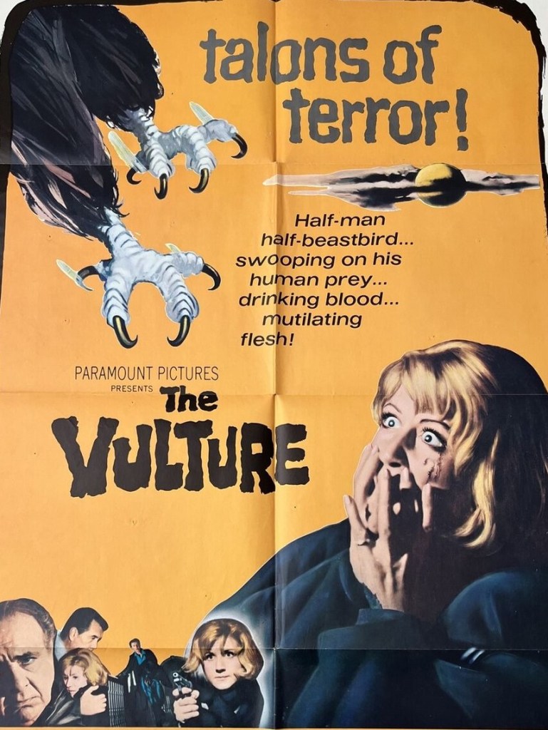 A woman taking a shortcut through a graveyard (as one does) spies a gravestone wobbling, earth erupting in front of her and has visions (enough to make her hair go white) of a huge bird with a man’s head. Visiting nuclear scientist Eric (Robert Hutton) takes an interest. His wife Trudy’s (Diane Clare) uncle Brian (Broderick Crawford) explains the legend of a Spaniard buried alive because he turned himself into a vulture and kidnapped a small child. His buddy, German professor Koniglich (Akim Tamiroff), expands on the story.