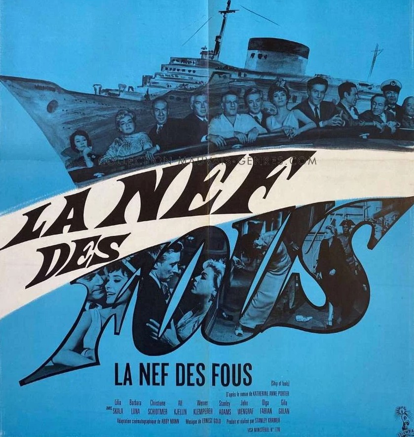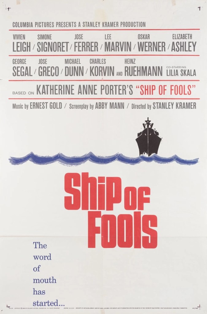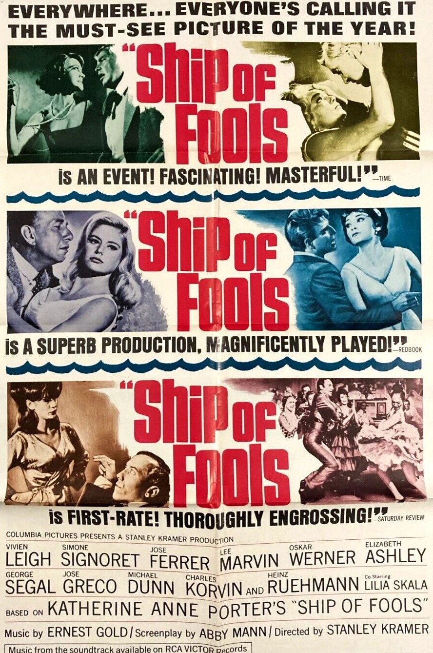 SOURCES: Stanley Kramer with Thomas F. Coffey, It’s A Mad, Mad, Mad, Mad World, A Life in Hollywood (Aurum Press, 1997) pp203-212; “New York Sound Track,” Variety, May 2, 1962, p4; “375G for Fools Novel,” Variety, May 2, 1962, p5; “Publisher’s Big Break,” Variety, May 23, 1962, p4; “Kramer to Produce Ship of Fools for Columbia,” Box Office, June 18, 1962, p9; “Abby Mann to Script Ship of Fools,” Box Office, November 1962, pSE4; “Top German Comic,” Variety, April 15, 1964, p23; “Simone Signoret Exits Zorba,” Variety, April 22, 1964, p11; “Control of Space,” Variety, May 6, 1964, p4; “Five Spaniards on Ship of Fools Irks SAG,” Variety, June 3, 1964, p5;“To Speed MacArthur for Ship of Fools,” Variety, June 10, 1964, p17; “27 Features Shoot in Color, Only Six in Monochrome,” Variety, August 5, 1964, p3; “Perennial Quiz,” Variety, September 2, 1964, p1; “15, Maybe 17, Pix for Roadshowing,” Variety, October 28, 1964, p22; “Too Many Roadshows,” Variety, August 2, 1965, p5. Box office figures, Variety September-November 1965, “Big Rental Pictures of 1965,” Variety, January5, 1966, p6.