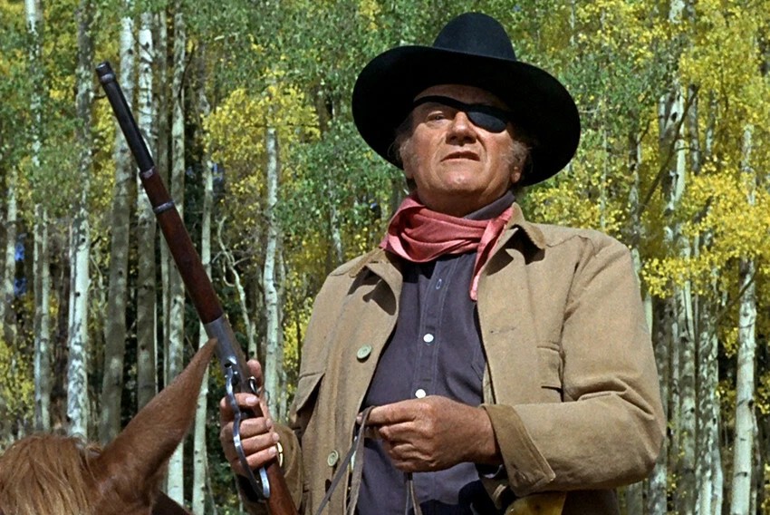We hear Cogburn’s voice before we see him, as if the director is preparing us for a different John Wayne. This is the actor in a new timbre, the usual slow drawl replaced by a raucous bark. And it is a different Wayne, one eye covered in a black patch, giving him a piratical look. He hustles the prisoners out, kicking one straggler viciously in the butt. Wayne walks differently, too. Instead of the famous slow walk, Cogburn is a man in a hurry, pushing forward with purposeful stride, ignoring Mattie as she comes racing after him, slamming the basement door in her face.