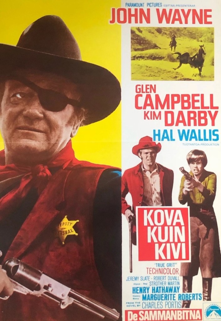 Unusually, for a film of the period, the movie repeated a single image in all of its advertising, Wayne’s face dominating the composition, with below him Mattie Ross standing gun in hand and Glen Campbell behind him. That Campbell sang the title song over the credits led to the release of a record, and there was a New American Library book tie-in. Ancillary promotional items included a t-shirt embellished with the words “This Man Has True Grit,” and buttons announcing “I Have True Grit” and, alternatively, “Give Me a Man with True Grit.” Stetson created a special hat called “The Duke,” with a special one costing $1,500 to be presented to Johnny Carson on his show, with an advertising campaign that included Playboy and Esquire while Aramis created a special line of “Grit Soap.”