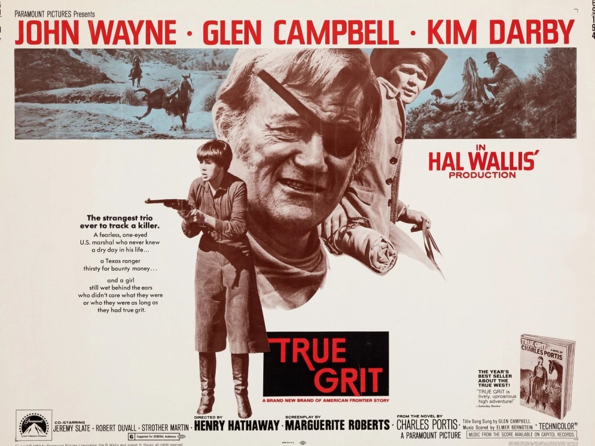 Unusually, for a film of the period, the movie repeated a single image in all of its advertising, Wayne’s face dominating the composition, with below him Mattie Ross standing gun in hand and Glen Campbell behind him. That Campbell sang the title song over the credits led to the release of a record, and there was a New American Library book tie-in. Ancillary promotional items included a t-shirt embellished with the words “This Man Has True Grit,” and buttons announcing “I Have True Grit” and, alternatively, “Give Me a Man with True Grit.” Stetson created a special hat called “The Duke,” with a special one costing $1,500 to be presented to Johnny Carson on his show, with an advertising campaign that included Playboy and Esquire while Aramis created a special line of “Grit Soap.”