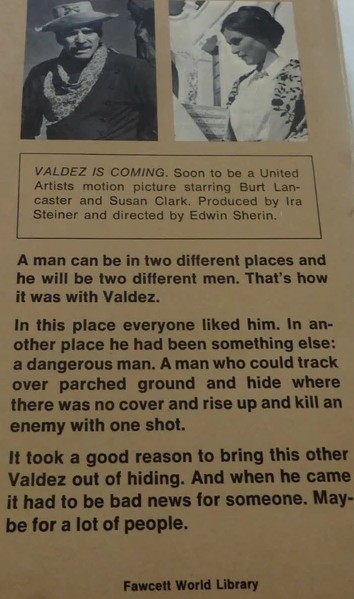 Valdez Is Coming made a speedy transition from paperback (published by Fawcett in the US in 1970, though it did achieve a hardcover edition in the UK) to movie (United Artists release 1971) and it’s interesting to see what changes, if any were made by screenwriters Roland Kibbee (The Appaloosa, 1966) and David Rayfiel (Castle Keep, 1969). You could literally transpose Leonard’s dialog and it would easily stand up in a movie. So the basic, very simple, plot is retained.