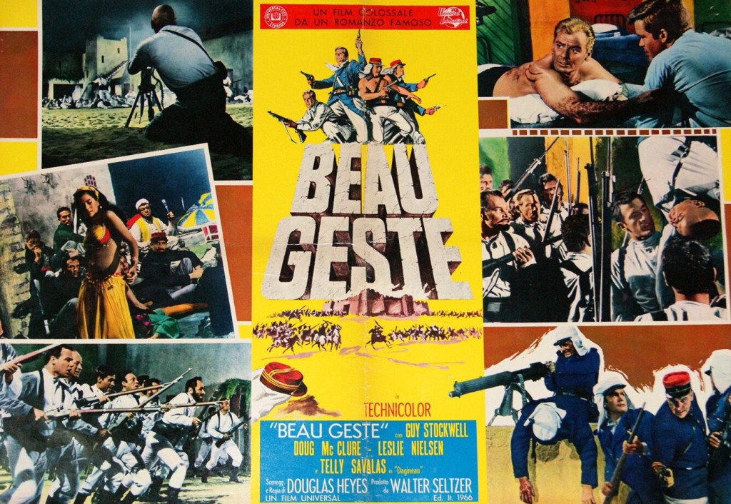 Two brothers battle inhospitable terrain, warring tribes and a sadistic sergeant major in a remake of the classic tale. The title translates as “noble and generous gesture” and is a pun on the name of hero Michael Geste (Guy Stockwell), an American hiding out in the French Foreign Legion in shame for being involved, innocently as it happens, in embezzlement. His attitude is markedly different to the “scum of the earth” who make up the battalion and his quick wit and refusal to kowtow make him a target for Sgt Major Dagineau (Telly Savalas), a former officer busted to the ranks.
