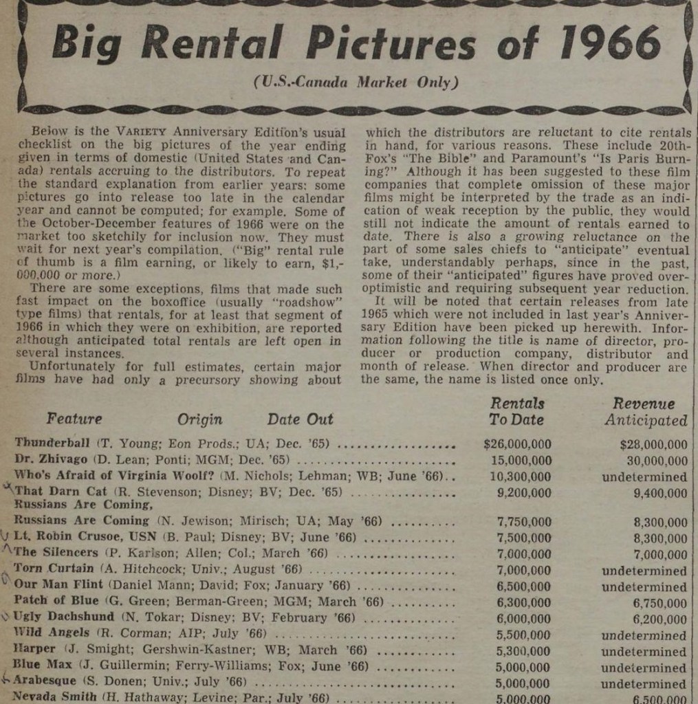 Weekly box was registered as gross, i.e. what the movie took in at each cinema. But Variety had another trump card to play. Once a year, it contacted the studios to ask them to provide not the cumulative gross for each release but the rental, i.e. the amount of dough returned to the studio after the cinema had taken its cut. That provided a more realistic basis for assessing how movies had actually performed in relation to their budgets.