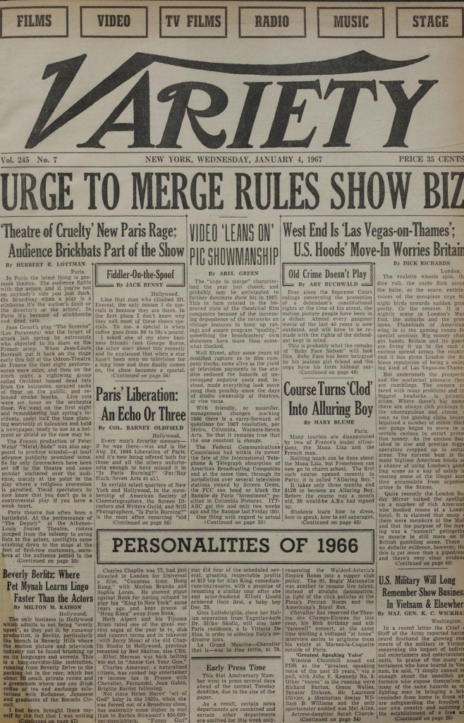 And it made a point of not favoring one particular element of the business. So on its front page, you’d find stories on each of the sectors it covered. However, by the 1960s, the front section of the magazine was devoted to movies and Variety was delighted to trumpet box office figures in news stories rather than just leaving it to the studios to highlight through adverts. Except that the magazine was exceptionally large in terms of page size, it wasn’t a great advertising vehicle. There was no color available unlike some of its competitors. The printing was more grainy than glossy.