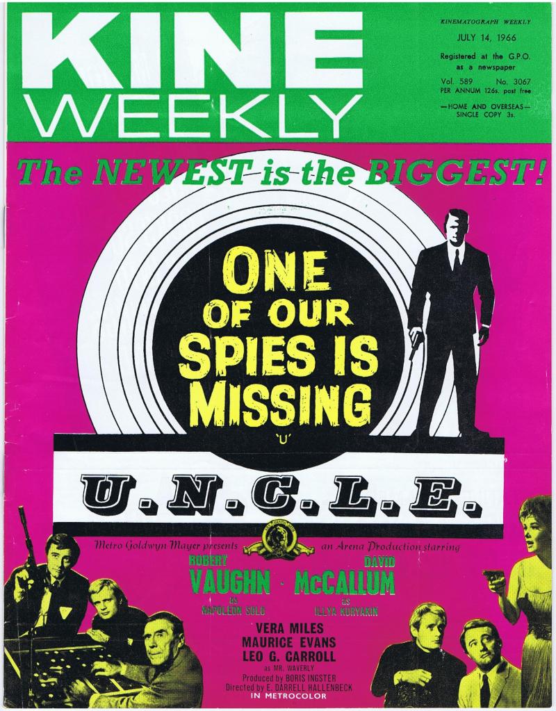 SOURCES: Allen Eyles, ABC: The First Name in Entertainment (CTA, 1993), p123; “Another Uncle Sequel As O’Seas Theatrical,” Variety, September 23, 1964, p79; “Uncle Gets 3rd Whirl As O’seas Feature,” Variety, January 27, 1965, p26; “International Soundtrack,” Variety, May 26, 1965, p26; “Toys from Uncle,” Variety, June 30, 1965, p42; “Uncle Stunt in London Is Metro Hit,” Variety, December 8, 1965, p23; “Metro Sees Uncle TV Stanzas As B.O. Kin to James Bond in Theaters,” Variety, February 2, 1966, p1; Review, Variety, February 16, 1966, p18; Review, Box Office, February 21, 1966, pB11; “Box Office Barometer,” Box Office, March 14, 1966, p22; “One Spy Looms MGM Leader in Britain,” Variety, March 20, 1966, p29; “Drive-Ins in New England Preparing To Solve Springtime Problems,” Box Office, March 21, 1966, pNE4; “Pacific Prefers Not To Follow Video,” Variety, April 20, 1966, p24; “Box Office Barometer,” Box Office, June 20, 1966, p14; “How Uncle in Great Britain Clicked Via Tie-Ups with Tele,” Variety, June 22, 1966, p17; “Uncle TV Conversions Boffo at B.O. Theatrically O’Seas,” Variety, March 20, 1968, p4; Box Office figures taken from the weekly edition of Variety in the “Picture Grosses” section on the following dates: in 1965 on November 10 and December 8, in 1966 from February 2 until June 1; and August 18, 1966.