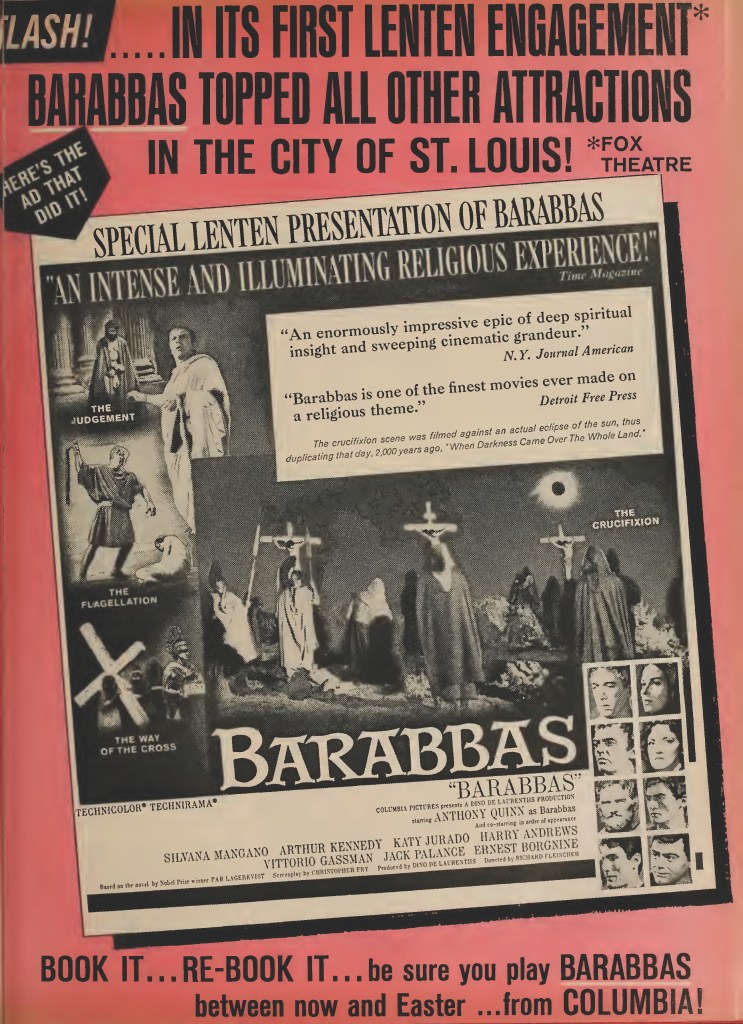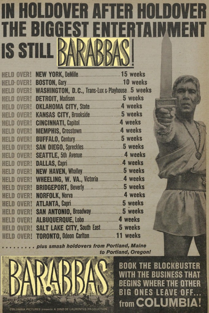 SOURCES: Richard Fleischer, Just Tell Me When To Cry, A Memoir (Carroll & Graf, 1993) p217-226; “Another Religious Picture May Be Barabbas Novel,” Variety, December 4, 1946, p4; “Now Barabbas Was A Robber,” Variety, June 1, 1949, p1; “First Swedish Picture Dubbed Into English,” Variety, June 23, 1954, p4; “Swedish Barabbas,” Variety, June 1, 1960, p4; “Lagerkvist, Nobel Winner, Assigns Son To Rome As Watchman on Barabbas,” Variety, December 14, 1960, p17; advert, Variety, January 4, 1961, p71; “Barabbas Budget over $10,000,000,” Variety, February 15, 1961, p3; “Dino De Laurentiis No 1 Indie Producer?,” Variety, February 15, 1961, p24; “Figure $17,500 for Off-Broadway Barabbas,” Variety, February 15, 1961, p71; advert, Variety, April 26, 1961, p71; “Becket Got 37½G On Quinn’s Exit,” Variety, May 3, 1961, p83; “Becket Folds As 40G Sleeper; Had Seemed Prestige-Only Flop,” Variety, May 31, 1961, p59; “Quinn Back To Work in Barabbas,” Variety, October 11, 1961, p17; “No Time To Fiddle in Rome,” Variety, November 15, 1961, p1; “To Write Barabbas Dialog,” Box Office, November 27, 1961, pW6; “Canada Coin,” Variety, March 21, 1962, p40; “Barabbas Exhibits Start Key City Tour,” Box Office, March 26, 1962, pE8; “Barabbas London Event: New York Date Oct 10,” Box Office, June 11, 1962, p14; “Barabbas Premiere Set For Oct 4 in Toronto,” Box Office, July 23, 1962, pE8; “Hard Cover Book to Ballyhoo Barabbas,” Box Office, July 30, 1962, p10; “Palance Back, Try Directing,” Variety, October 17, 1963, p3; “Big Barabbas Float,” Box Office, January 4, 1963, pA1; advert, Variety, January 23, 1963, p27; “Barabbas at Eight,” Box Office, February 18, 1963, pK2; “Lenten Angle for Barabbas Date,” Variety, March 13, 1963, p17; “Top Rental Features of 1963,” Variety, June 8, 1964, p37.