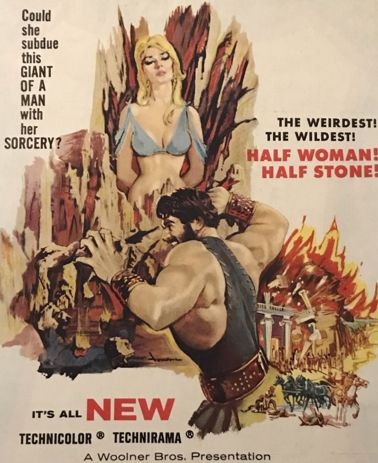 It’s not a film to fit into the so-bad-it’s-good category, but of course imagination too often exceeds budget which renders the filmmaking somewhat random at times and like the bulk of the peplums acting skill is not at a premium. As you might expect, the British-born Reg Park was a bodybuilder first – three times winner of the Mr Universe title – and an actor second. He played Hercules again another three times and Maciste once but outside this narrow comfort zone made no other films. But he was Arnold Schwarzenegger’s inspiration, so that was probably enough. American Fay Spain (The Private Life of Adam and Eve, 1960) never got beyond bit parts as a B-movie bad girl and television, although she was seen in The Godfather: Part II (1974). Italian Laura Efrikina made her debut here and cou would later spot her as Dora in the Italian television mini-series David Copperfield (1966).